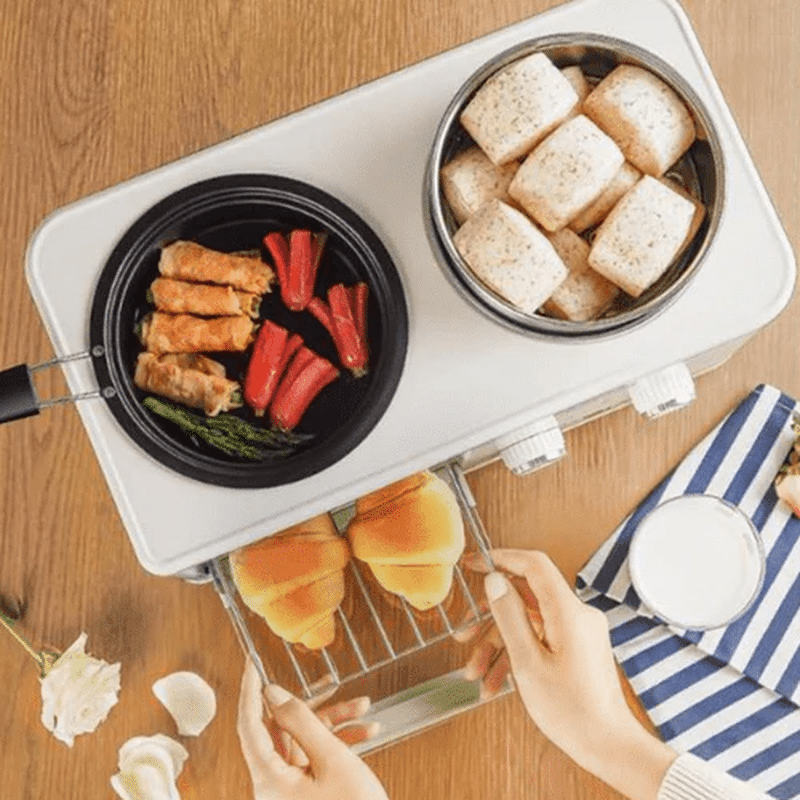 Perfect for preparing complete meals quickly, the 4-In-1 Breakfast Maker is ideal for small kitchens, dorms, offices, or RVs. Its multifunctional design ensures you can cook a variety of dishes simultaneously, from eggs and bacon to bread, cookies, and soups.