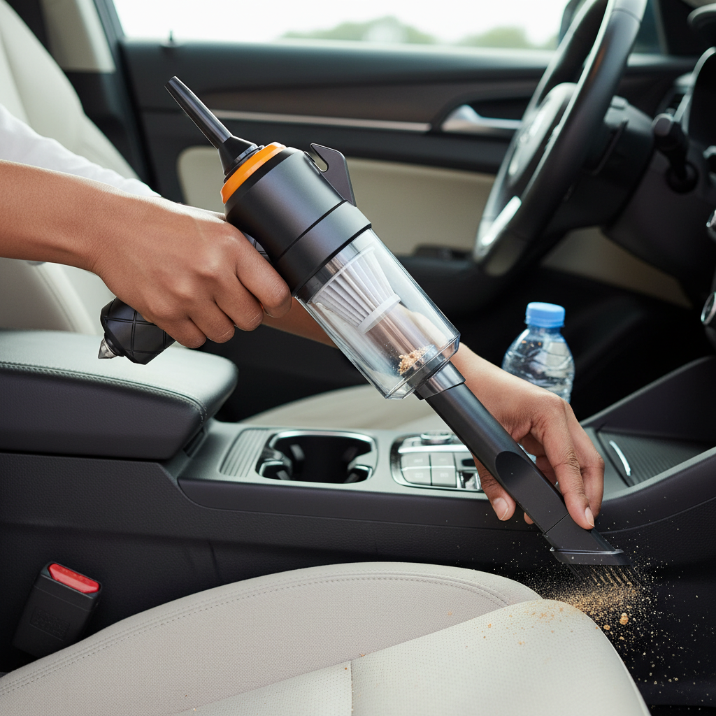 Using a Cordless Handheld Car Vacuum Cleaner to clean car seats and remove dust from the interior.Cordless Handheld Car Vacuum Cleaner in sleek design with detachable brush attachment.Cordless Handheld Car Vacuum Cleaner with transparent dust container and ergonomic grip for easy use.Cordless Handheld Car Vacuum Cleaner with detachable nozzle and ergonomic handle for easy cleaning.
