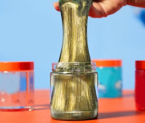 • Three containers of crystal-clear slime infused with vibrant colors.