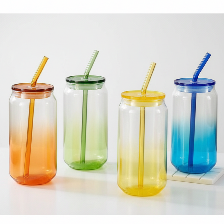 Sip your favourite drinks in style with the 16oz Gradient Jelly Glass Can Cup, featuring a colourful gradient design, a secure PP plastic lid, and a convenient straw for easy, mess-free drinking.