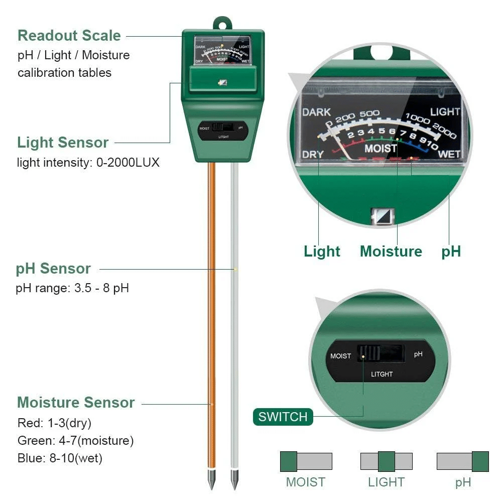 • 3-in-1 Functionality: Measures soil moisture, sunlight intensity, and pH levels.