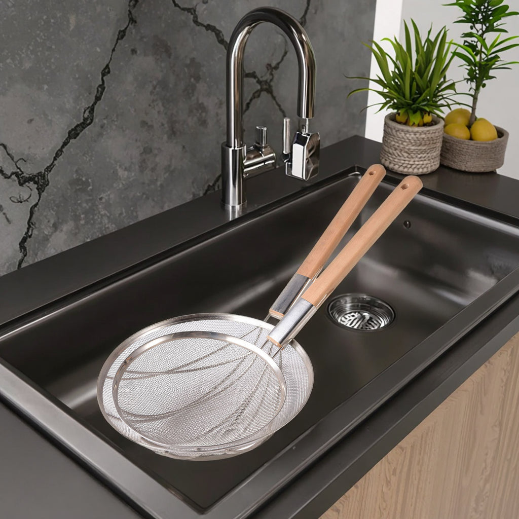 Make large-scale cooking simple with this jumbo 32 cm stainless steel kitchen strainer. Designed for busy home cooks and professional chefs, it handles frying, draining, rinsing, and sifting tasks with ease. The fine stainless steel mesh ensures efficient straining, while the sturdy wooden handle offers a safe, comfortable grip. Perfect for handling bigger quantities of noodles, vegetables, or flour, this strainer is a must-have for any kitchen.