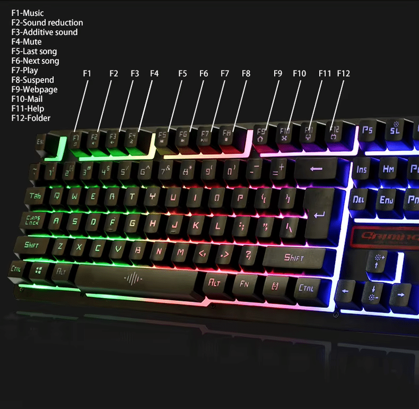 Elevate your gameplay with the K13 Wired Professional Gaming Keyboard with Mouse, designed for gamers seeking vibrant lighting, precise controls, and hassle-free setup. This wired USB combo includes a full-size 104-key keyboard with dynamic RGB lighting and a performance optical mouse with adjustable DPI. Featuring durable splash-resistant keys, ergonomic design, and plug-and-play compatibility across Windows, Mac, and Linux systems, the K13 delivers both style and function in a sleek, budget-friendly package.