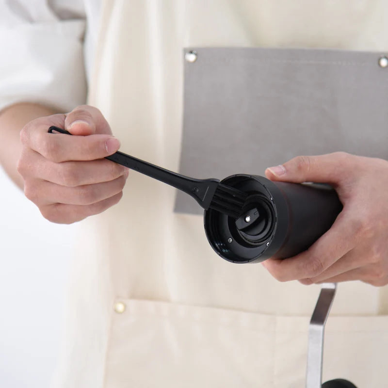 Manual Ceramic Coffee Grinder being cleaned with a brush for optimal maintenance and flavor preservation.