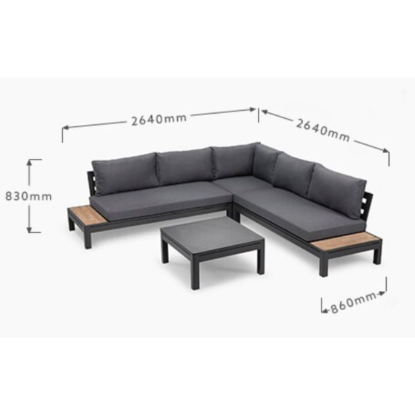 Transform your outdoor area into a luxurious and inviting retreat with the Six Seater Corner Patio Lounge Set. This spacious Bristol modular corner lounge features a contemporary charcoal design with a durable aluminium frame, plush polyester cushions, and built-in teak wood side tables, complete with a matching aluminium coffee table—perfect for creating the ultimate staycation spot on your patio, garden, or undercover outdoor space.